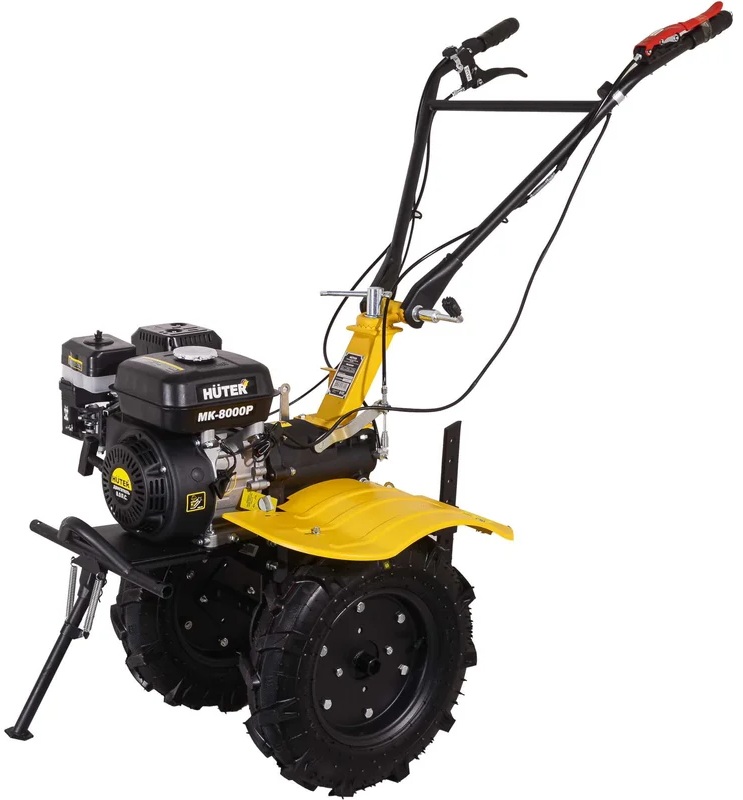 Мотоблок HUTER MK-8000P принадлежит к линейке универсальных сельскохозяйственных машин среднетяжелого класса, с массой в снаряженном состоянии – 88 кг. Агрегат предназначен для выполнения большого объема работ в непрерывном режиме. Силовая установка мотоблока представлена одноцилиндровым 4-х тактным бензиновым двигателем с ручным запуском и с системой активного воздушного охлаждения. Двигатель имеет блокирующую защиту от низкого уровня масла в картере. Впрыскиваемое карбюратором в камеру сгорания топливо обогащается воздухом через маслонаполненный воздушный фильтр. При расходе топлива 375 гр*кВт в час, двигатель развивает мощность 8 л.с. (5,9 кВт). Система автоматической регулировки оборотов двигателя, в зависимости от нагрузки на навесное оборудование, значительно облегчает управление сельскохозяйственной машиной. Шестеренчатый редуктор, в чугунном корпусе, обеспечивает передачу крутящего момента на рабочую сквозную ось и на вал отбора мощности. На рабочую ось симметрично навешиваются фрезы для рыхления почвы или ведущие колеса. От вал осуществляется привод активного навесного оборудования, устанавливаемого на мотоблок с помощью универсального сцепного устройства. Использование штатного комплекта фрез позволяет обрабатывать полосу шириной 100 см за один проход. Мотоблок HUTER MK-8000P имеет три передачи, одна базовая, вторая пониженная для тяжелых грунтов и для работы с активным навесным оборудованием и одна передача назад для легкого извлечения фрез из грунта.